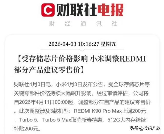小米集团总裁卢伟冰今日公开回应,直言 “实在顶不住了”。他表示,同版本内存价格相比去年 Q1 飙升近 4 倍,12+512GB 存储成本涨了约 1500 元,16+1TB 版本涨幅更离谱,对主打性价比的 REDMI 品牌造成巨大冲击。为此,小米宣布 4 月 11 日起,REDMI K90 Pro Max 上调 200 元,Turbo 5、Turbo 5 Max 取消新春特惠,仅 512GB 版本保留 200 元补贴。