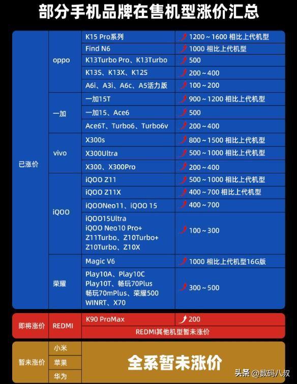 不止小米,国内所有手机品牌均受波及。华为 Mate 70 系列 512GB 版本涨价 500-800 元,小米 15 Ultra 512GB 版涨 700 元,OPPO Find X8、vivo X200 系列大存储版本涨幅均超 10%。千元机市场几乎消失,2000 元档机型普遍取消 512GB 选项,3000 元以上机型才能买到大存储,手机消费门槛大幅提升。